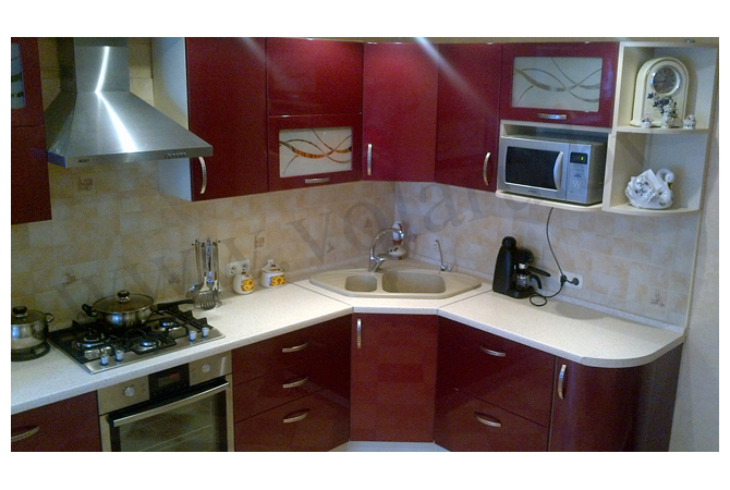 В комплект входит 1 дверь, имеет гнутую форму. В витринах – алюминиевый профиль. Столешница с кромкой 3D. Есть место под встраиваемую плиту и стиральную машину.