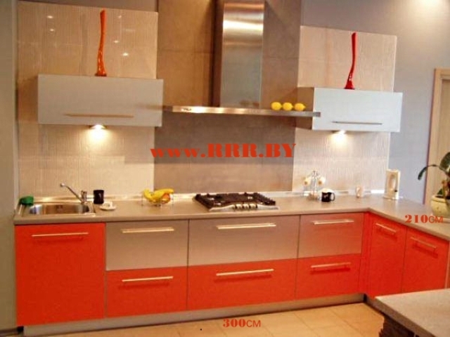 Угловая кухня привлекает своим ярким и современным дизайном. Фасады выкрашены в сочетание оранжевых и белых цветов. Подвесные модули оснащены подсветкой. Такое оформление будет создавать постоянную атмосферу праздника у вас квартире.