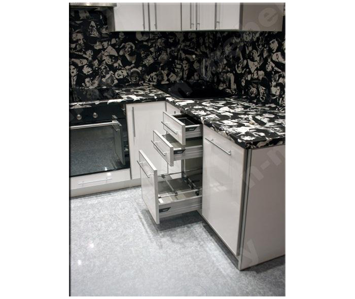 Угловая кухня представляет собой стильную компактную конструкцию. Каркас гарнитура выполнен из качественного ДСП, фасад в алюминиевом профиле изготовлен из пластика. Створки снабжены металлическими ручками и за счет современных механизмов работают плавно и бесшумно.