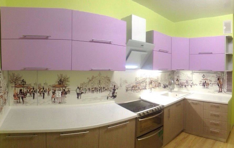 код 68397Фартук с рисунком. Яркие розовые фасады. Светлая столешница и тумбы.