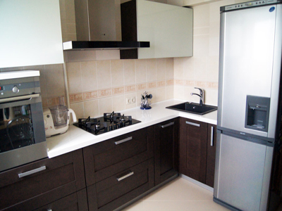 Угловая кухня с белой столешницей – это компактная конструкция, которая отлично подойдет для обустройства не слишком большого помещения. Фасады верхних шкафов окрашены в молочный оттенок, а нижние ящикы выполнены в расцветке венге темный.