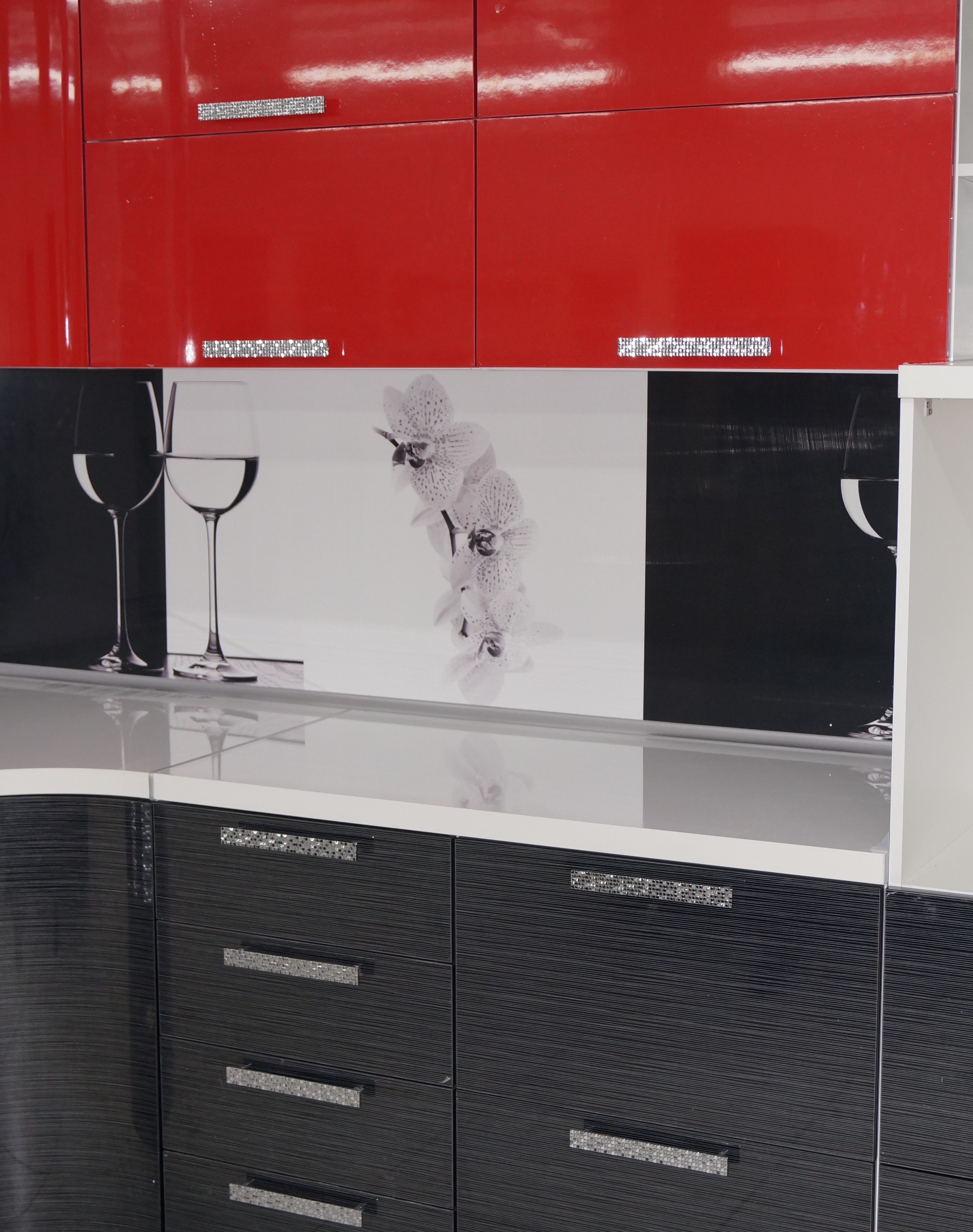 Кухонные ручки оригинально инкрустированы блестящим напылением. Расширенное рабочее место создает больше простора на кухне.