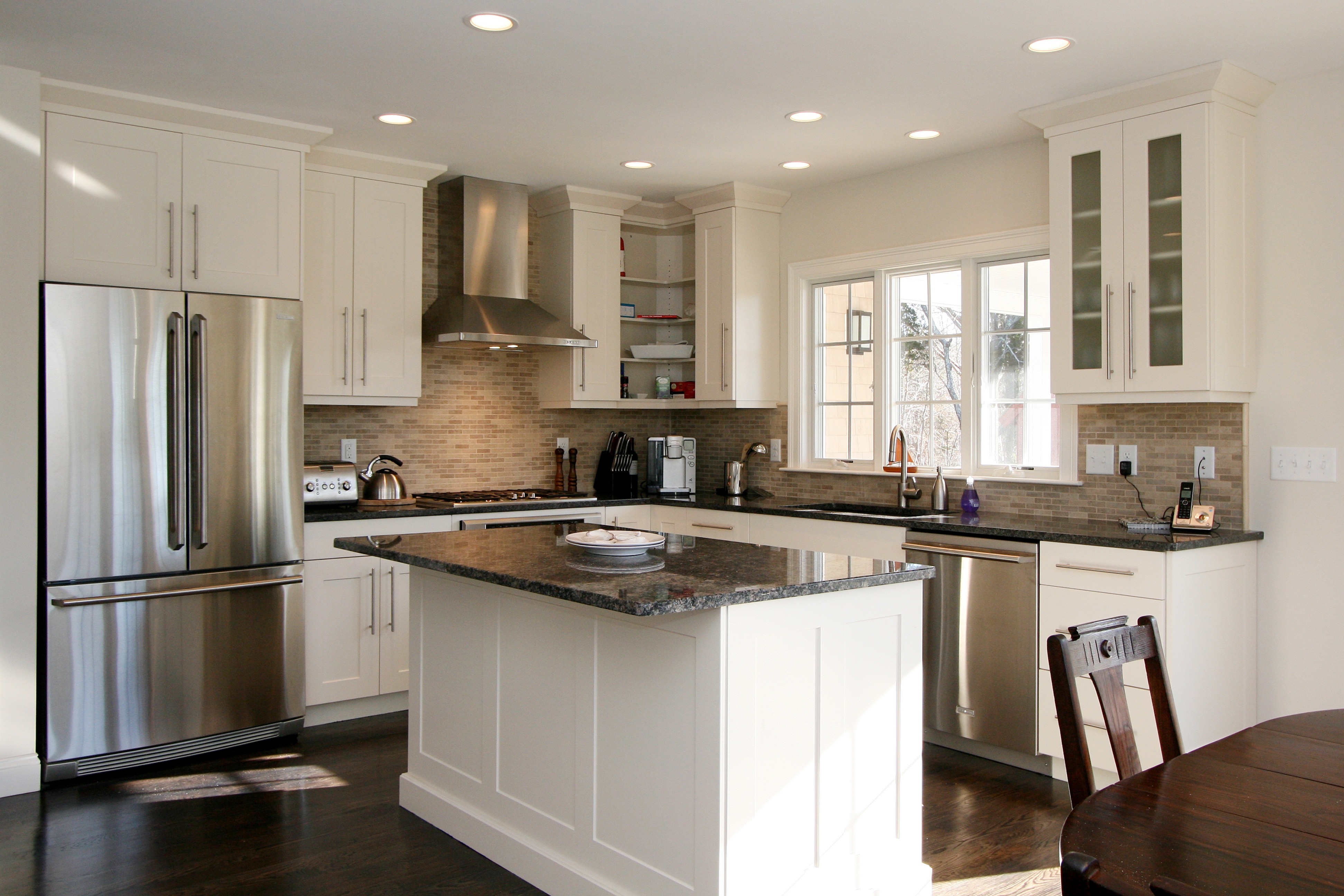 Белые глянцевый фасады без ручек. Вариант для малогабаритной кухни или квартиры-студии.