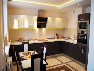 Навесные шкафы окрашены в белый цвет и оборудованы подсветкой. Столешница обладает ударопрочной поверхностью.
