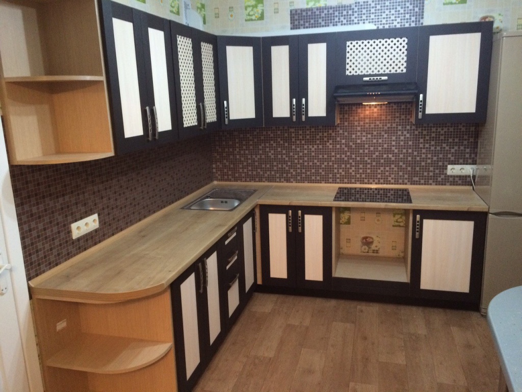 Стильный угловой гарнитур подойдет как для небольшой кухни, так и для светлого просторного помещения. В оформлении модели используется несколько цветов, удачно сочетающихся друг с другом. Предусмотрено наличие подсветки и открытых полочек для предметов декора.
