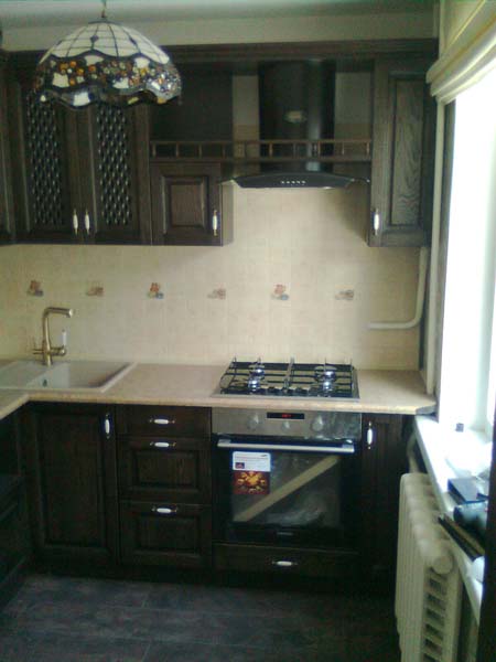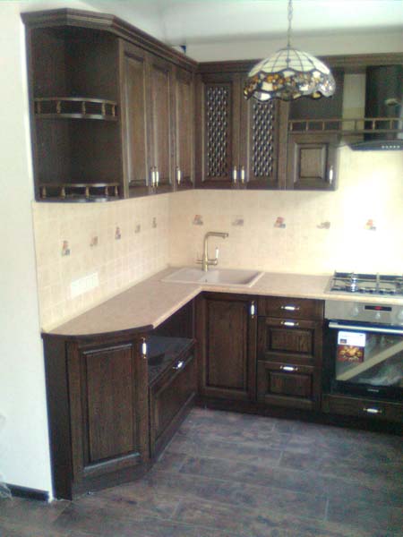 Кухня выполнена в классическом стиле, который подчеркивается благодаря резным вставкам и древесному цвету фасадов. Подвесная секция комплектуется ящиками с распашными створками и угловой полкой открытого типа радиусной формы.