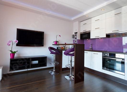Представленная угловая кухня выполнена в темном корпусе с белым фасадом. Фартук гарнитура исполнен в приятном фиолетовом оттенке. Компактная кухня не занимает много места и без труда украсит пространство кухни или столовой.