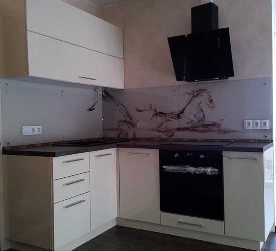 Кухня имеет довольно компактные габариты, что не отразилось на её функциональной составляющей. Скинали кухни выполнены с фотопечатью со стилизованным изображением лошади.