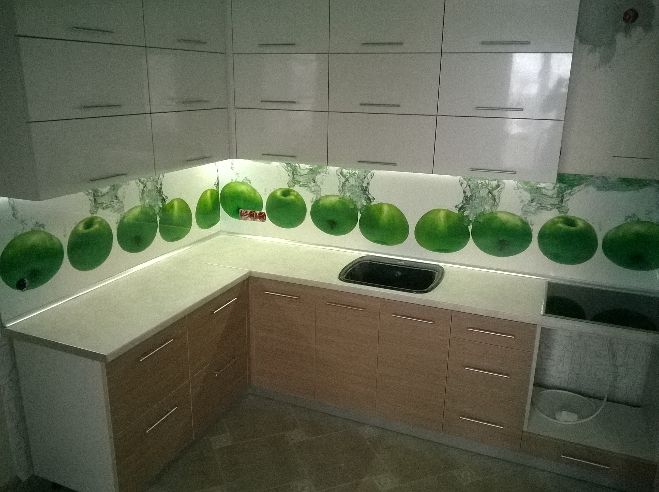 Угловая кухня из пластика представлена в современном дизайне с глянцевыми фасадами и фасадами под дерево. Модель выполнена в комбинированной цветовом стиле, с использованием белого цвета и декором под дерево. Визуальной свежести кухни добавляет скиналь с изображением яблок. Функционально кухня отлично оснащена, множество вместительных ящиков позволят хранить в них всю кухонную утварь.