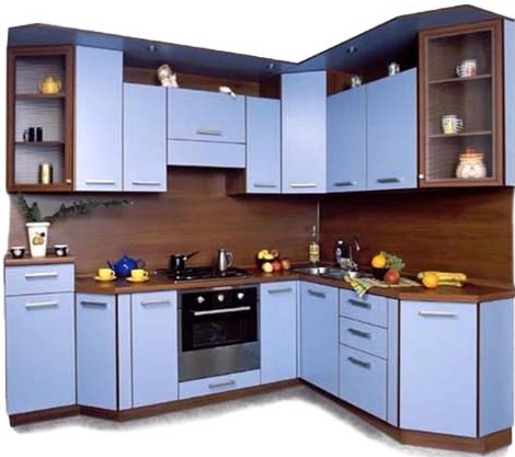 Кухня угловая с голубым цветом створок
