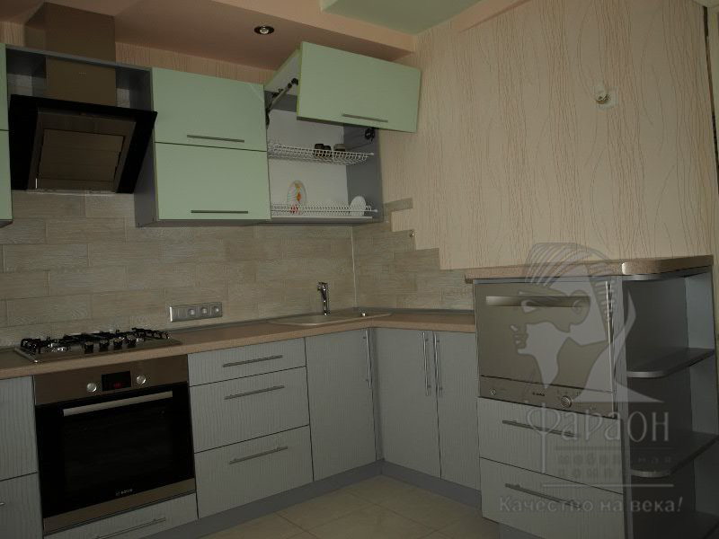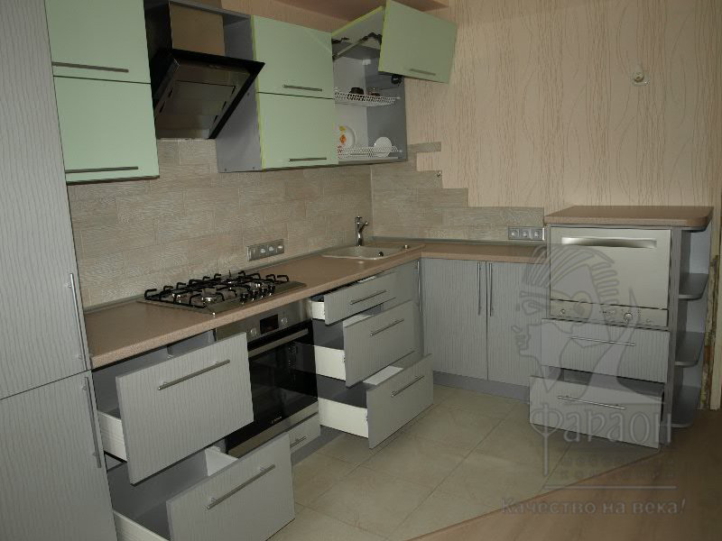 Угловая кухня отличается комбинированным исполнением: нижние фасады окрашены в серый цвет, верхние – в салатовый. Ящики комплектуются только качественной и современной фурнитурой, обеспечивающей плавное и бесшумное открывание. Предусмотрены открытые полочки.