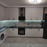 Фасады: пластик 3091gls с интегрированными ручками. Столешница: RESOPAL 4939-KS. Фурнитура: BLUM, BOYRD.