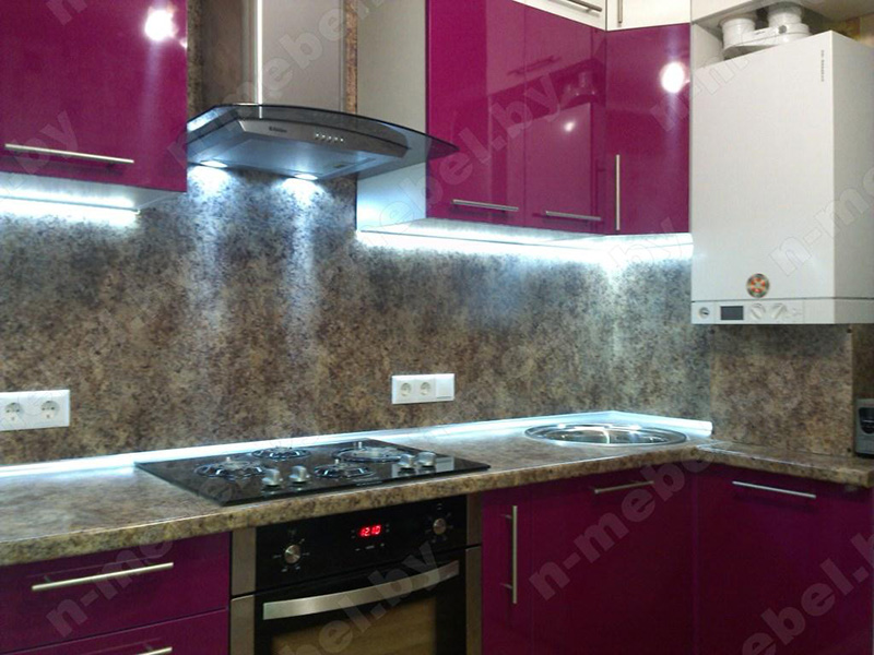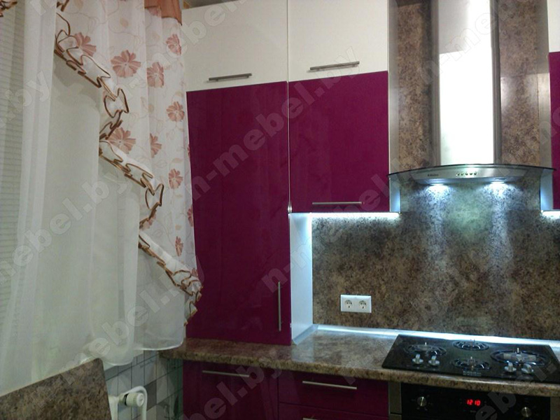 Угловая кухня с малиновым фасадом, дополненным вставками белого цвета, выполнена в современном стиле. Для удобной эксплуатации створки шкафов оснащены металлическими ручками, покрытыми хромом. Панель, защищающая стенку рабочей зоны от повреждений и загрязнений, выполнена из того же материала, что и ударопрочная столешница.