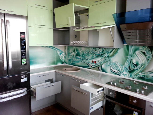 Угловая кухня оснащена большим количеством ящиков различного типа. Наличие ниши для холодильника позволит сэкономить место и выдержать гарнитур в одном стиле. Рабочий фартук из плитки с рисунком воды в бирюзовых оттенках смотрится стильно и необычно.