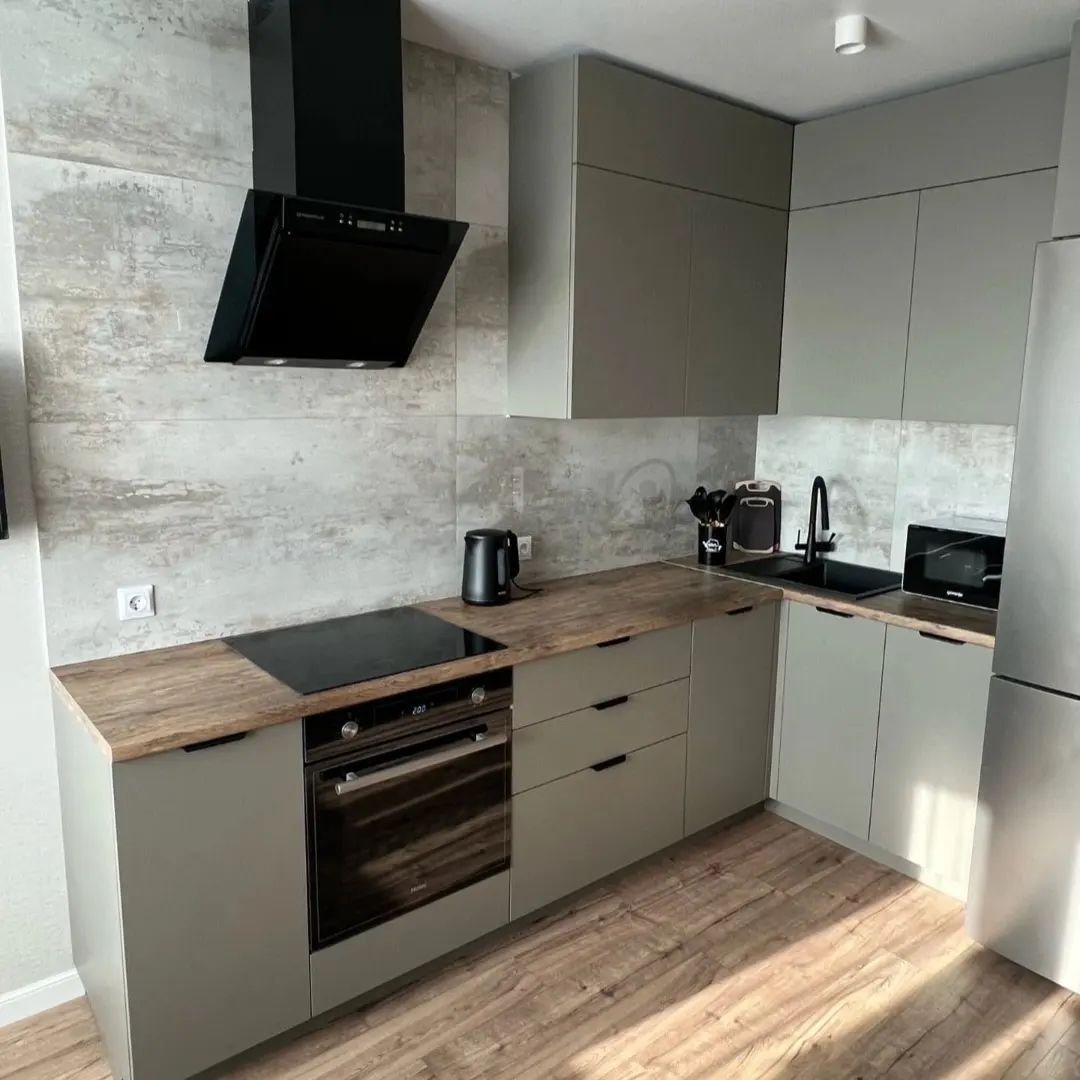Современная угловая кухня в серых тонах. Верхние фасады без ручек.