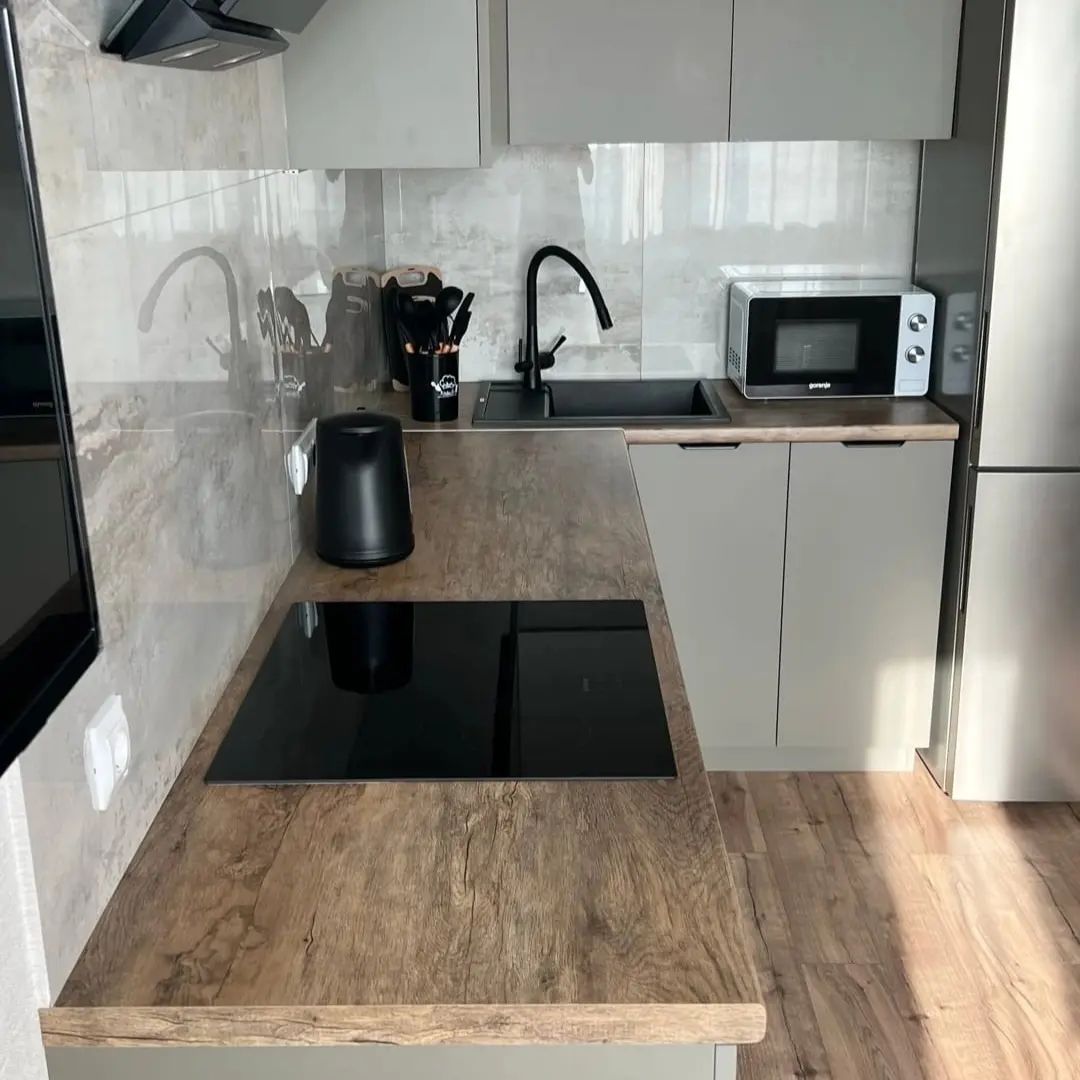 Кухня с глухими фасадами в природных тонах. Материал: ЛДСП.
