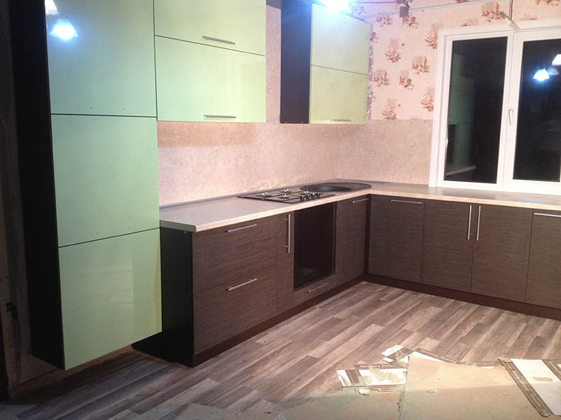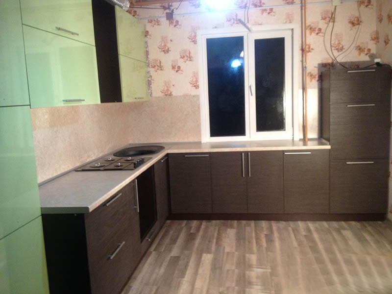 Отличительной особенностью угловой кухни является вместительный подвесной пенал. Часть створок окрашены в нежный зеленый цвет, а остальные представлены в темно-коричневом тоне. Широкая светлая столешница позволит без труда разложить все принадлежности и продукты, которые могут понадобиться при приготовлении обеда.