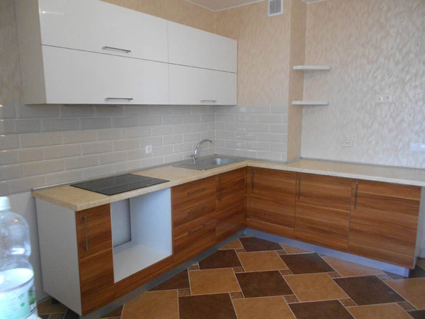 Угловая кухня обладает комбинированным фасадом: приятный древесный цвет мягко сочетается с белым глянцем. В состав гарнитура входят две небольшие угловые полочки. Нижние фасады изготовлены из ЛДСП и покрыты лаком, верхние – из пластика.