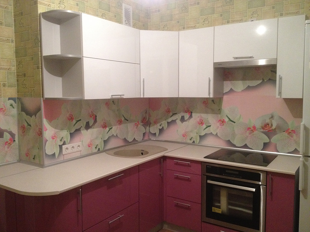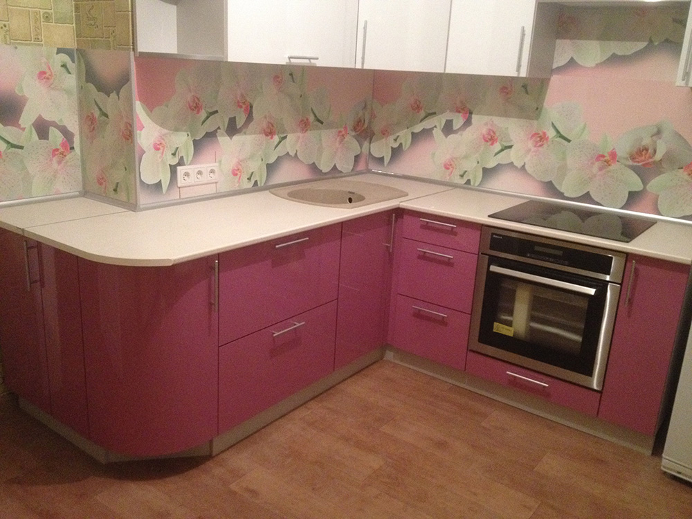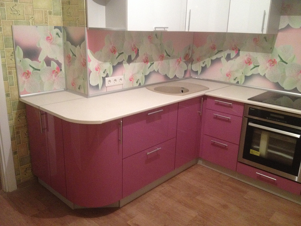Фасады напольных тумб данного кухонного гарнитура выполнены в розовом цвете. Подвесные шкафчики исполнены в белом цвете. Гарнитур оборудован петлями с доводчиками, газ-лифтами на горизонтальных створках и сушкой для посуды. Каркас кухни выполнен из ДСП.