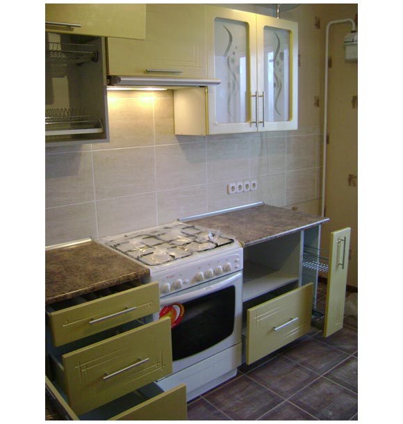 Кухня представляет собой современный угловой гарнитур. Салатовый фасад благотворно скажется на аппетите. Гарнитур оснащен большим количеством модульных элементов и имеет все для комфортного приготовления пищи.