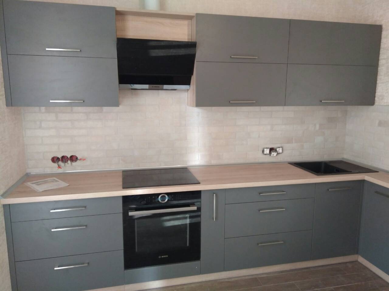 Удобные металлические ручки в цвете «сатин». Ширина кухни 190 см.