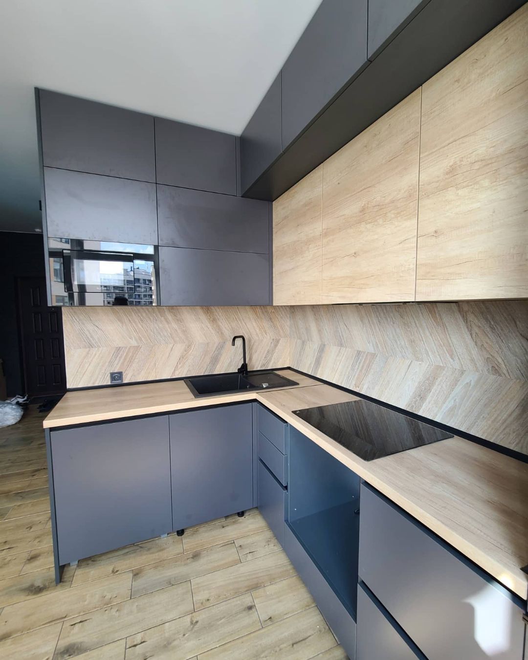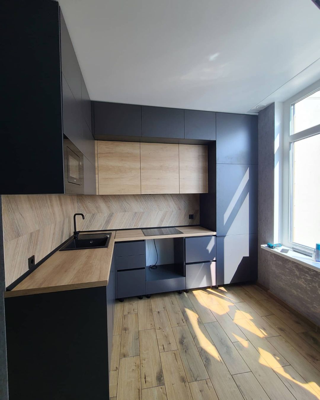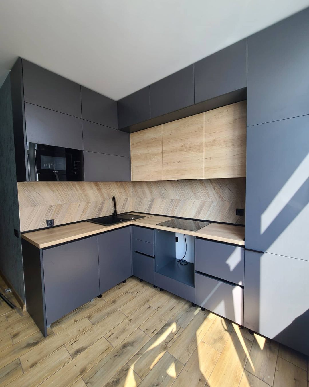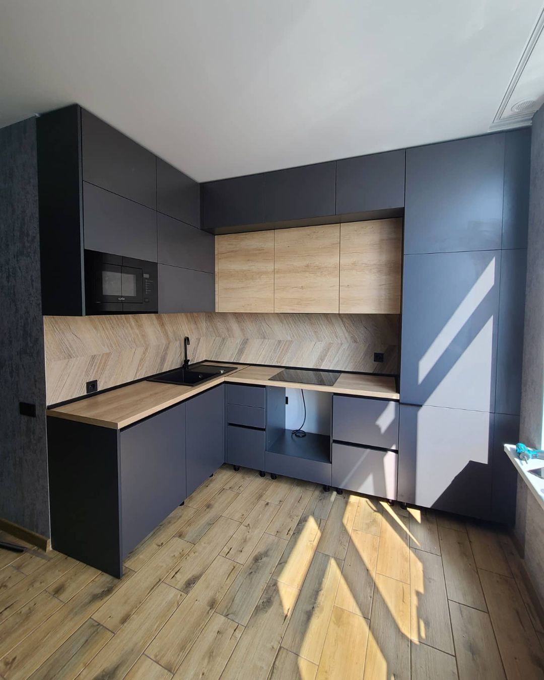 Комбинированные фасады, ниши для техники, интегрированные ручки.