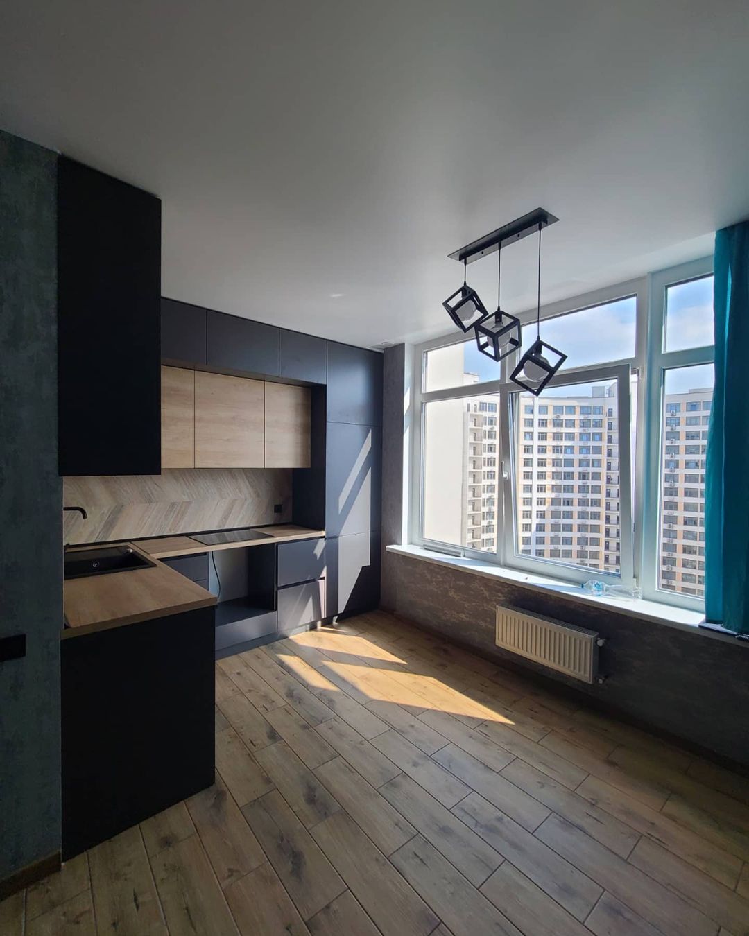 Прямая конструкция, полный комплект из навесных и напольных шкафов.