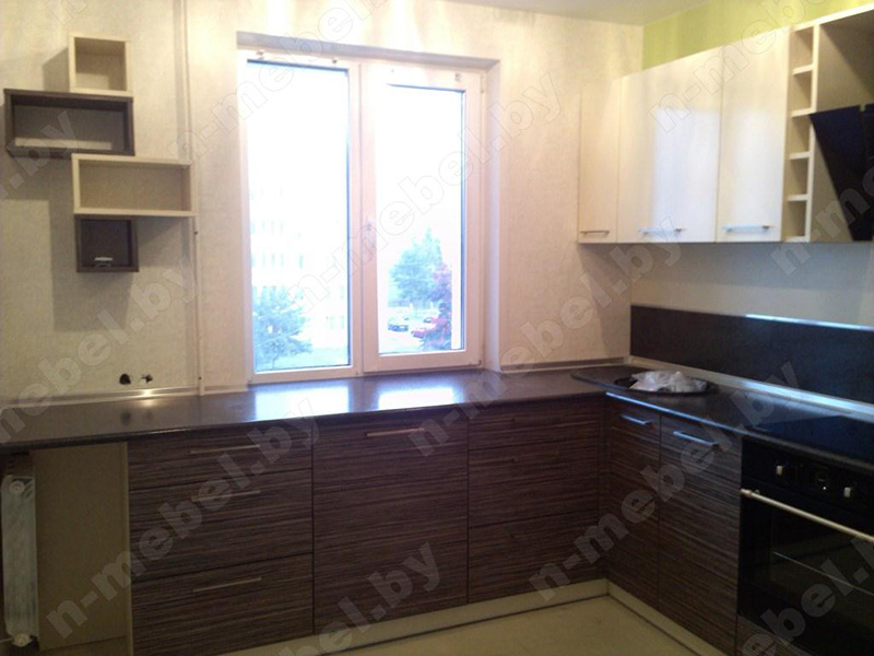 Угловая кухня с удлиненной столешницей обладает компактными размерами, что актуально при обустройстве небольшой комнаты в квартире или загородном доме. Створки с удлиненными ручками представлены в двух оттенках, прекрасно сочетающихся друг с другом. Широкая столешница позволит разложить продукты и принадлежности, которые могут понадобиться для приготовления пищи.