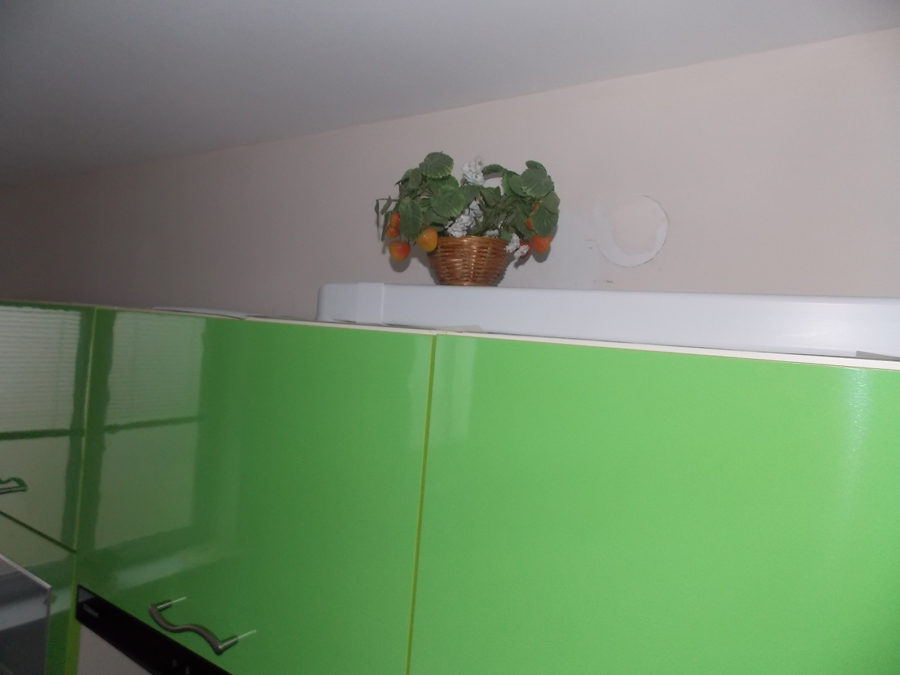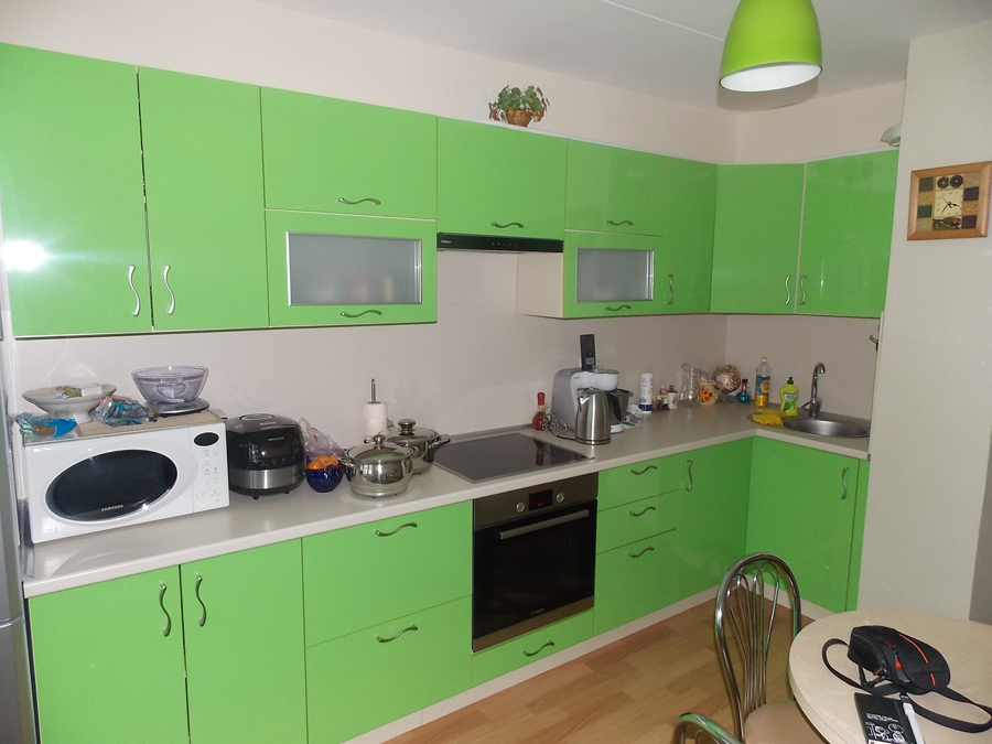 Салатовый фасад угловой кухни подарит умиротворенную атмосферу, положительно скажется на аппетите. Одной из особенностей гарнитура стали волнистые ручки. Фасады покрыты глянцем и будут эффектно смотреться в хорошо освещенных комнатах.