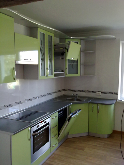 Компактная угловая кухня с глянцевыми фасадами