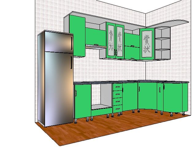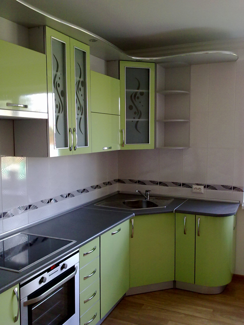 Кухня угловая салатовая со стеклянными вставками