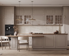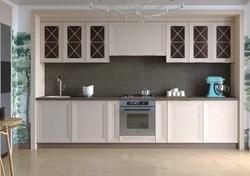 Материалом изготовления послужил натуральный массив, который всегда будет на пике моды. Часть верхних фасадов декорирована вставками из стекла с золотистыми узорами. Боковой верхний модуль оснащен радиусными полками открытого типа. Столешница из качественного материала представлена в цвете, который чуть светлее основного оттенка кухни.