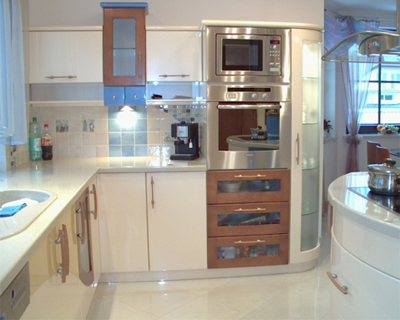 Светлая угловая кухня с комбинированными радиусными фасадами