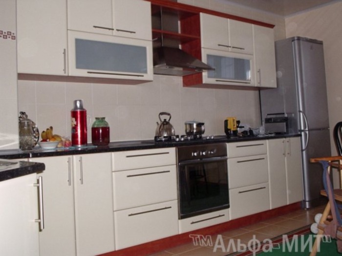 Комбинированные фасады из МДФ. Ширина кухни 200 см.