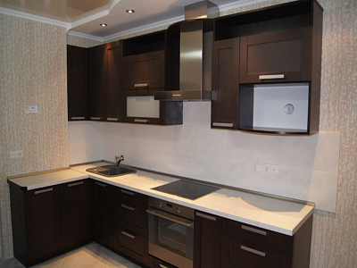 Угловая темно-коричневая кухня представляет собой компактную конструкцию, которая отлично подойдет для обустройства не слишком большого помещения.