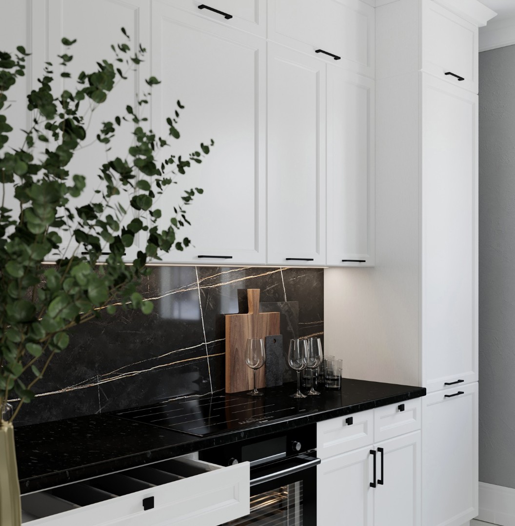 Матовые фасады, интегрированные ручки, пенал для техники.