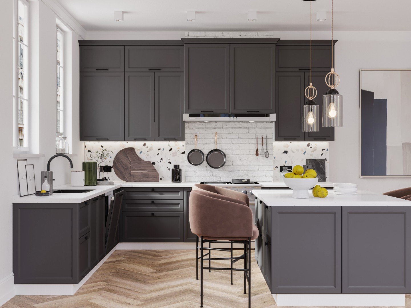 Лаконичный гарнитур с фасадами мягкого серого оттенка.