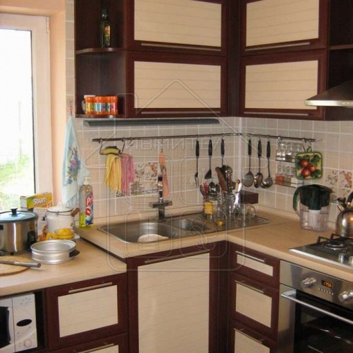 Фабричная угловая кухня. Большое количество функциональных полок и ящиков.