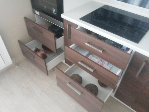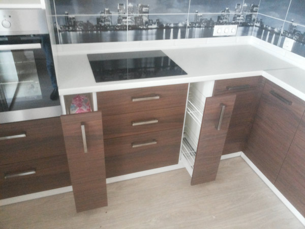 Угловая кухня представляет собой современный гарнитур в мягких тонах. Удачное сочетание цвета орех и белого обуславливает привлекательный внешний вид. Предусмотрено большое количество модульных элементов, ящики оборудованы только качественной фурнитурой.