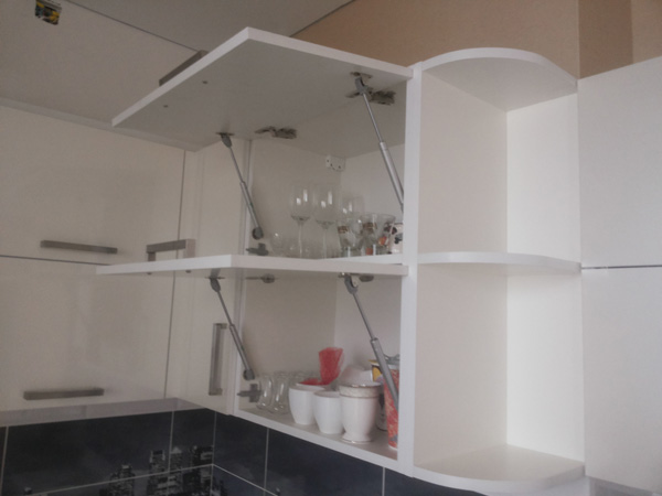 Угловая кухня с большим пеналом. Подсветка. Подвесные верхние шкафы.