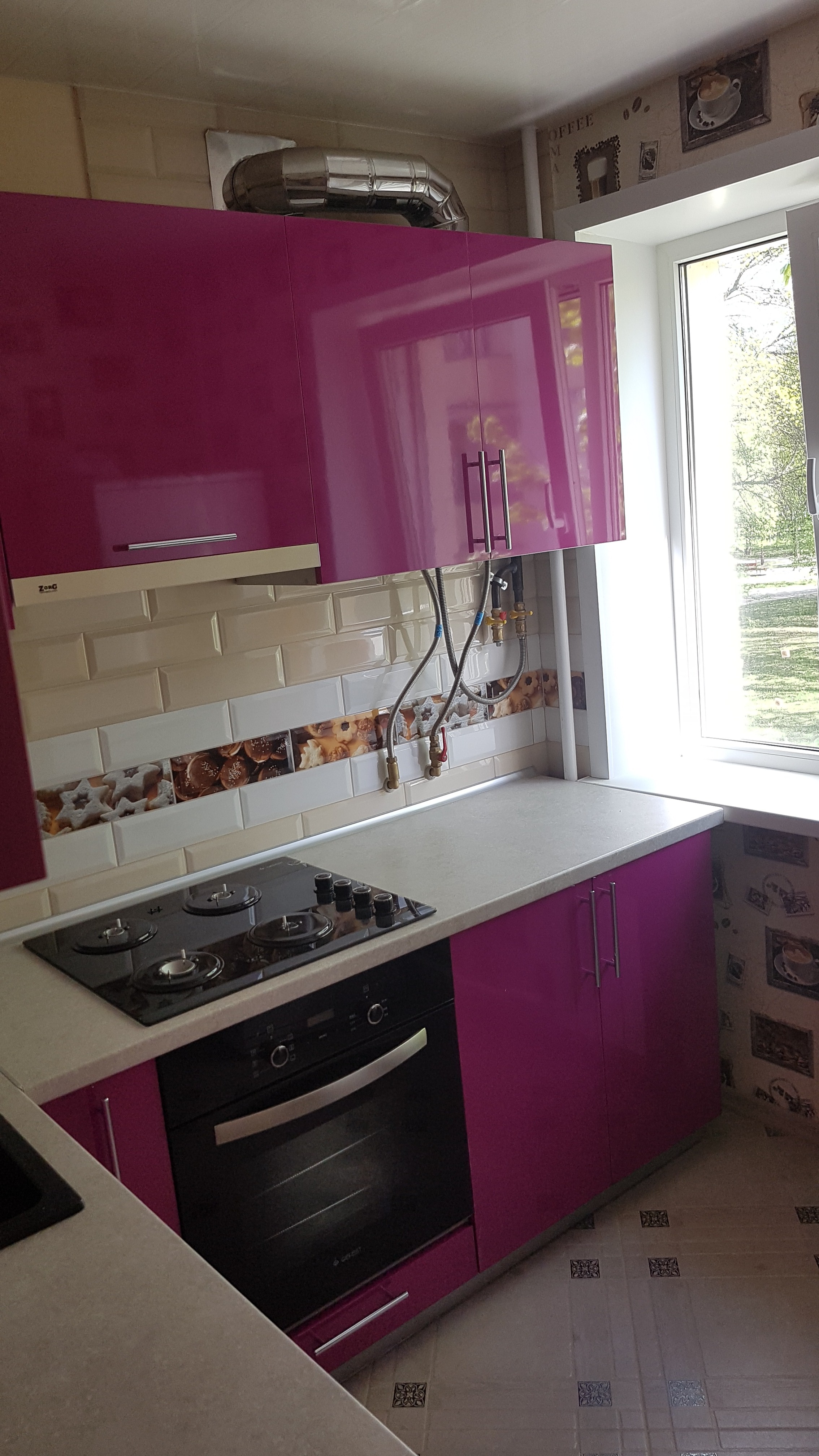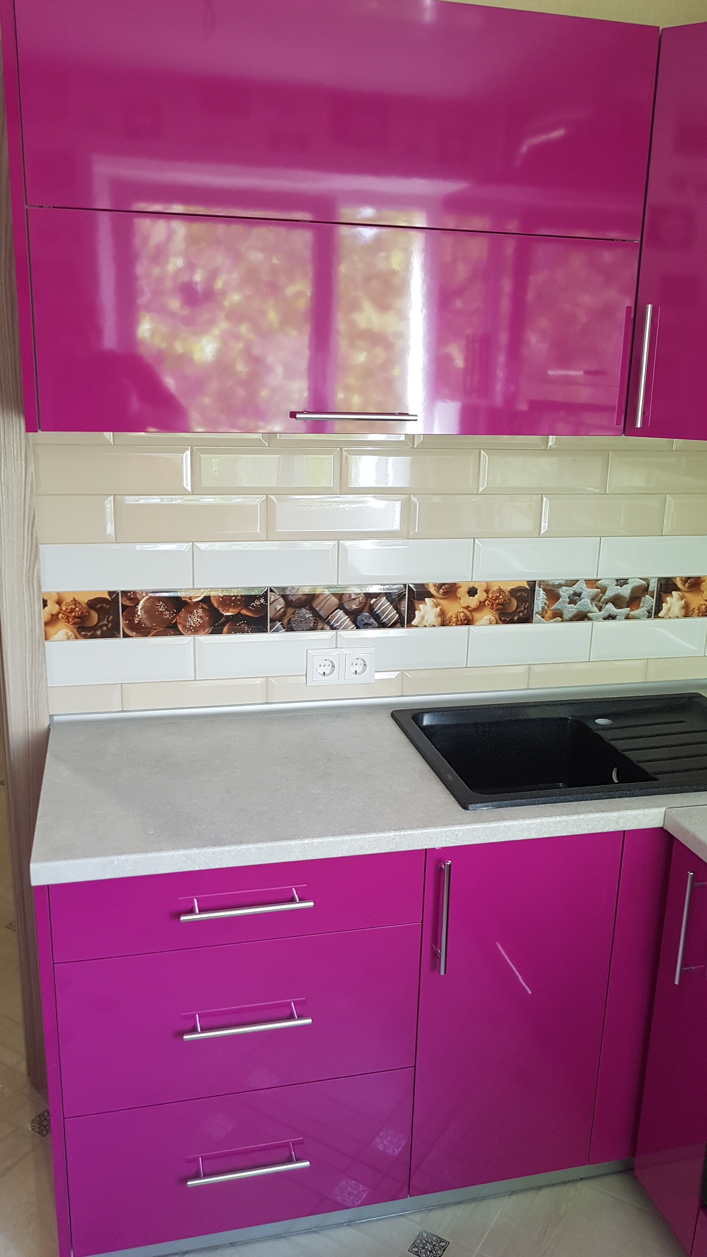 Угловая кухня выполнена в ярком розовом цвете. Габаритная столешница позволит полностью сосредоточиться на кулинарном искусстве, а также держать под рукой все необходимые кухонные принадлежности. Оснащается гарнитур обилием выдвижных ящиков и шкафчиков для посуды.