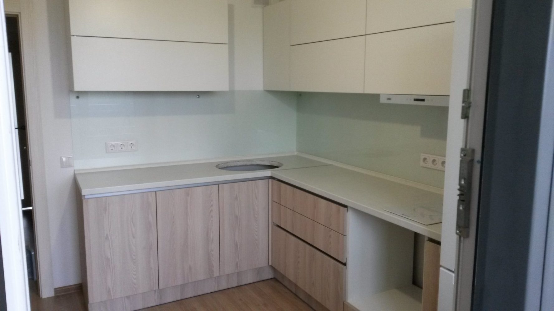 Современная линейная кухня. Разные цветовые решения фасадов и столешницы.