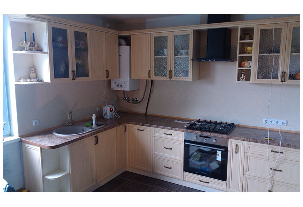 Угловая кухня выполнена в светлых тонах. Легкое классическое исполнение подарит вам ощущение тепла и уюта. Набор включает в себя большое количество выдвижных и распашных ящиков, предназначенных для хранения различного рода кухонной утвари.