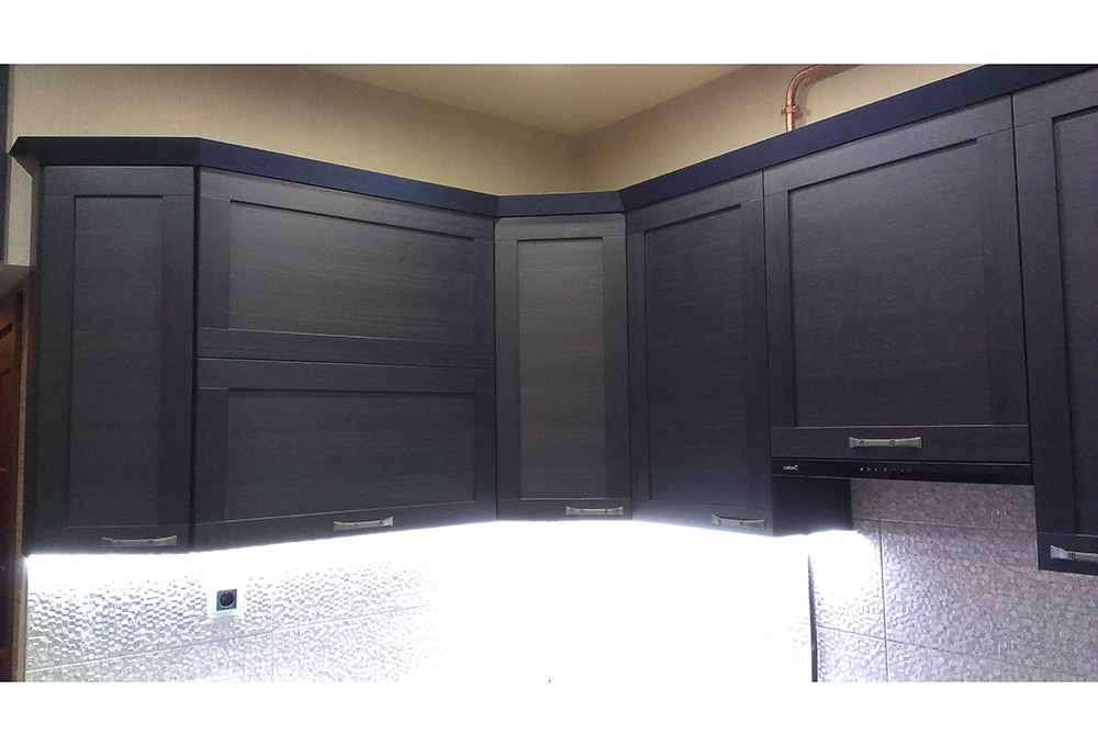 Угловая кухня окрашена в насыщенный цвет венге с яркой подсветкой. Столешница под камень, просторная, с возможностью встраивания варочной панели и кухонной мойки. В оформлении модели используются традиционные металлические ручки-скобы, выполненные в оригинальном дизайне, придающим ручкам величественность.