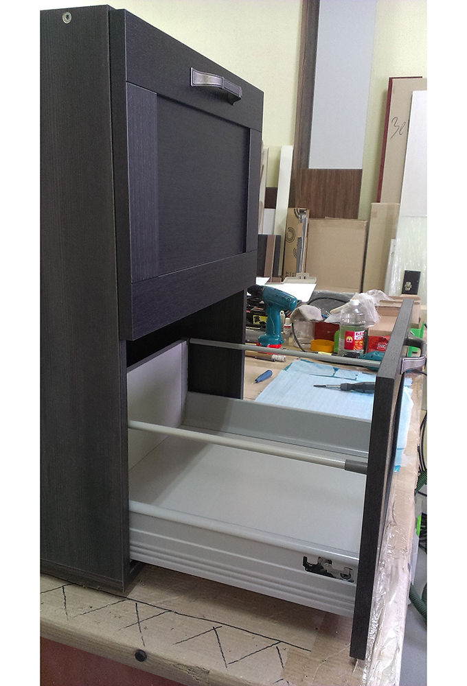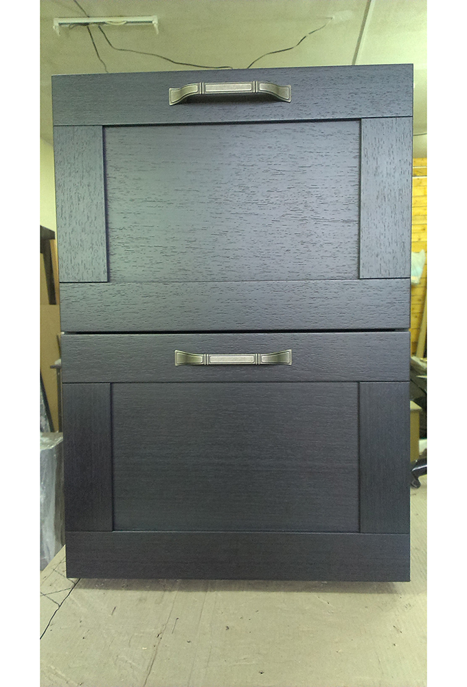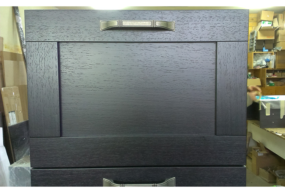 Готовый гарнитур с комбинированными фасадами из ЛДСП. Ширина кухни 150 см.