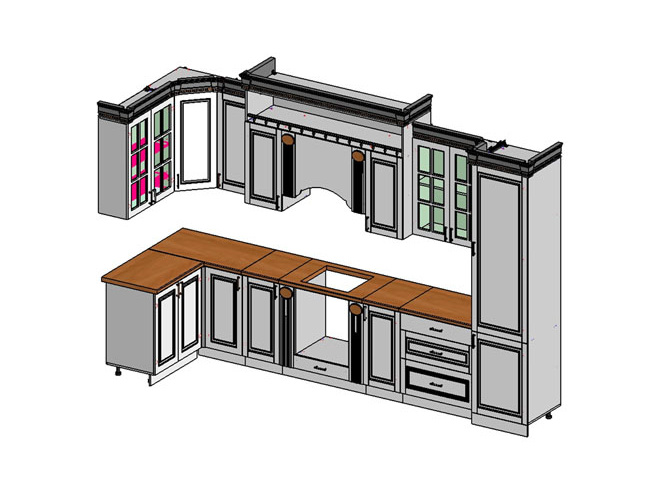 Материал фасада и корпуса: ЛДСП 16 мм. Ширина кухни 230 см.