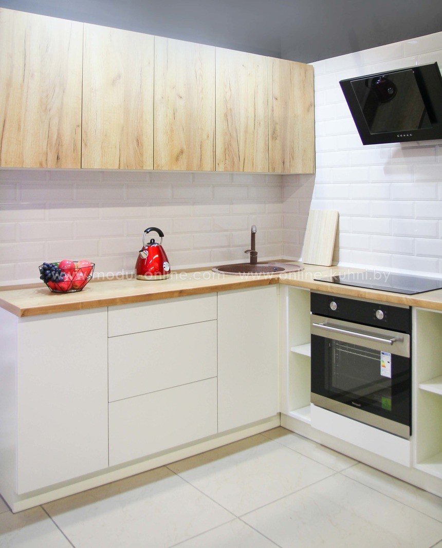 - Комплект поставки. Нижние и верхние кухонные модули, фасады (каждый в отдельной упаковке), цоколь, защитный профиль, столешница, пристенный плинтус + заглушки, сушка, ручки, соединительные планки.