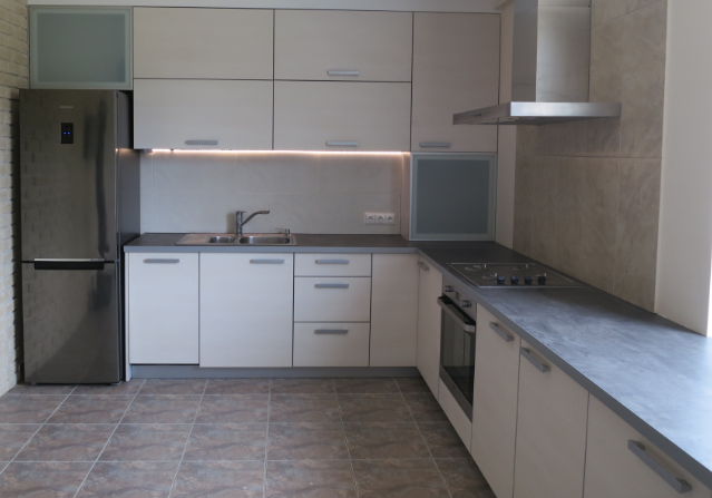 Матовые фасады с минималистичной фрезеровкой. Фурнитура: Blum (Австрия).