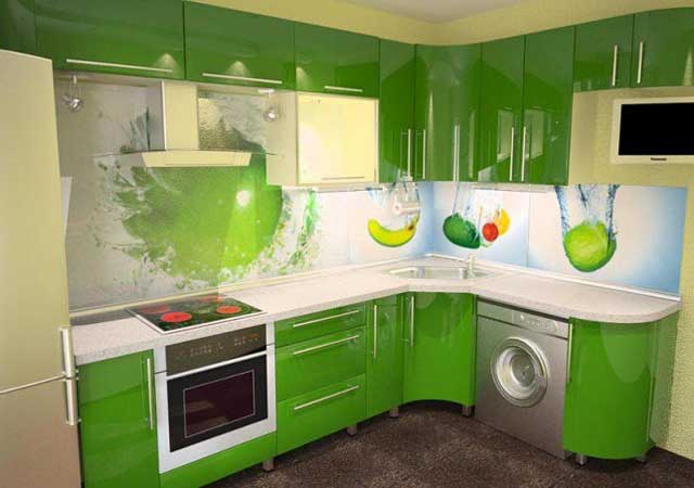 Угловая кухня выполнена в ярко-салатовом цвете. Фасад имеет плавные закругленные формы.