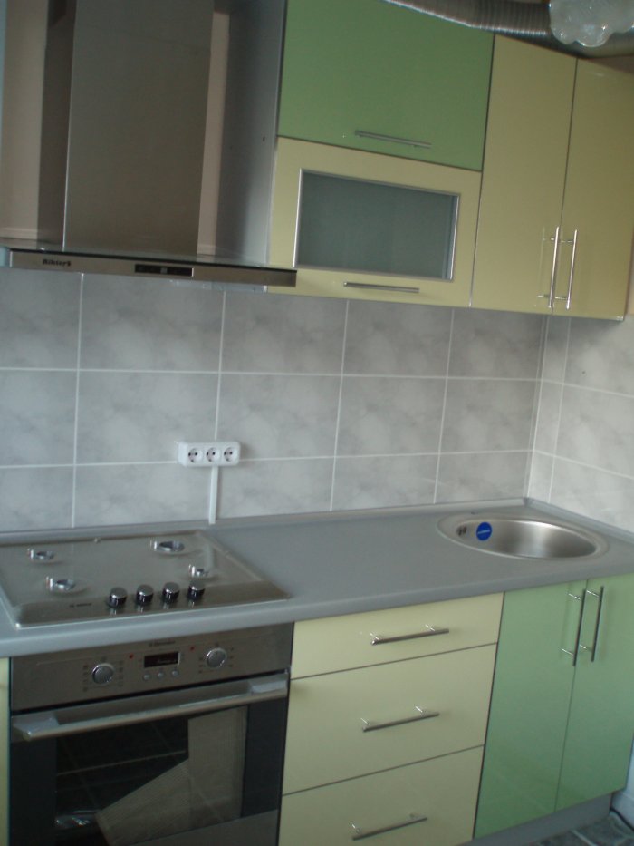 Лакомат – полупрозрачное стекло, которое отличается своей устойчивостью к царапинам и отсутствием отпечатков. Фасады выполнены в теплых весенних тонах – желтый и зеленый. Такое сочетание будет сохранять весенюю атмосферу у вас на кухне.